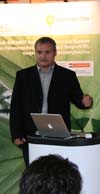 A konferenciát dr. Varga Dénes, az NymE-ERFARET Nonprofit Kft. ügyvezetője és kutatója nyitotta meg. Indító gondolataiban az innováció és a kooperáció fontosságáról beszélt, majd beszámolt a projekt pénzügyi hátteréről, a támogatás felhasználásáról.