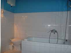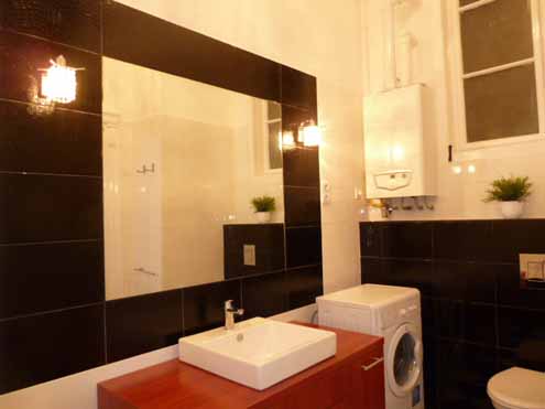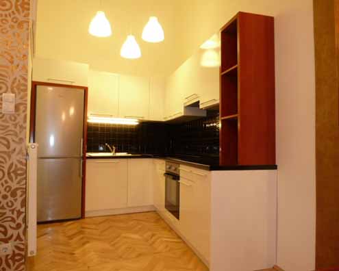 A fürdőszobában Nova Bell York (37x25cm) magasfényű fekete és fehér falicsempével burkoltunk, 2mm-es fuga távolsággal 226,6 cm-es magasságig. Az ajtóval szemben levő falra, a mosdó fölé struktúrált felületű, kigyóbőr mintás, fekete csempekeret készült a 111,4x100,6 cm-es tükörnek. A Grohe falba épithető Wc tartály beépitése után a fali Wc-nek, vizes helyiségbe való gipszkartonból 15 cm mélységű, 125,8 cm magasságú parapetfalat épitettünk, melyet lekentünk folyékony szigetelőanyaggal is. Beépitettük a 180x80 cm-es, kétszemélyes kádat, felszereltük a fali Wc-t, a króm nyomólapot és az antik cseresznye szinű mosdószekrényt, amelyre a pultra szerelhető, szögletes mosdó került. A megfelelő világitásról a mennyezetről lelógó krisztály csillár és a tükör két oldalán levő kristály függős falikarok gondoskodnak. Az L alakú konyhabútor korpusza fehér, a frontja magasfényű fehér laminált bútorlap, a munkalap és a vizzáró magasfényű fekete, az L alak két végén, az önálló inox szinű kombinált hútőszekrény körül futó keret (36mm) és a munkalapra helyezett nyitott polcos elem antik cseresznye szinű. A munkalap és felső elemek közötti 55 cm-es csikba 10x10 cm-es, magasfényű fekete, a páraelszivó alatti részre struktúrált mintázatú csempe került. Az ajtókra, horizontálisan elhelyezett alu foganytyúkat szereltettünk. A mennyezetről 3 féle hosszúságban lelógó, 3 db fehér szinű, műanyagbúrás függeszték és a mosogatómedence fölötti 100 cm-es fénycső gondoskodik a megfelelő világitásról.