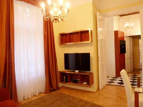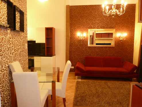 A nappaliban az arany-velencei vörössel tapétázott falra 2 db antik arany gyertyaizzós falikar, közéjük aranyfóliás keretbe foglalt tükör, elé 3 személyes, bordó szinű Nova Life textilbőrrel kárpitozott Andante kanapé, elé matt és fényes, 3 cm-es arany szinű szálakból gépi csomózással készült Shaggy szőnyeg és 10mm-es hajlitott biztonsági üvegből készült dohányzó asztal került. A központi világitást a falikarokkal egy lámpacsaládba tartozó (Ideal Lux Dora) 8 karú, gyertyaizzós, antik arany csillárral oldottuk meg.