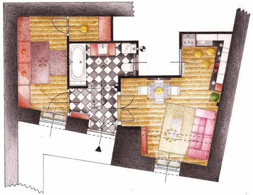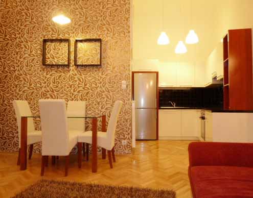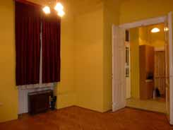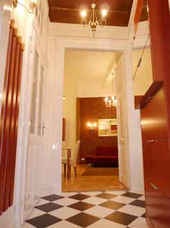 A két szobában meglevő halszálka mintában rakott csaphornyos tölgy parkettát felcsiszoltattuk és tükörfényes Trilak Lazurán Prolux kétkomponensű oldószeres lakkal lelakkoztattuk. Mivel a konyha a nappalival egylégtérbe került, ide és a hálószobából nyiló tárolóba is ilyen parkettát rakattunk. A bútorokat asztalossal készitettük, egységesen Falco antik cseresznye 18 mm-es laminált bútorlapból. Az előszobában a mérőórák és a biztositék tábla eltakarására antik cseresznye szinű korpusszal és frontokkal beépitett szekrényt készitettünk, amely 3 részből áll: az alsó és felső része 22 cm mély cipős és tárolószekrény, középső része 28 cm-es mélységű tükörfrontos, le és felnyiló ajtókkal. Vele szemben a falra 6 db 6,3x150x1,8 cm méretű antik cseresznye szinű léceket rögzitettünk, melyekre lenyitható arany szinű fogasokat szereltünk. A fogasok fölé antik arany falikar, a mennyezetre 3 karú, gyertyizzós, antik arany csillár került. Az előszobából küszöb nélkül a fürdőszobába átfutó, diagonálban rakott, matt fekete-fehér padlólap (Nova Bell York 30x30cm, PEI5) 10cm-es fehér lábazatot kapott.