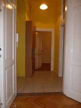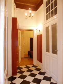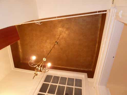 Az előszobában a 322 cm-es magasságban futó gázcső miatt a polisztirol diszléc 325 cm magasra került, de itt a falat festettük fehérre. A mennyezetre arany-terra szinű Margburg La Venezia vlies tapéta került, mely a falon lefut a diszlécig, 334 cm-ig.
