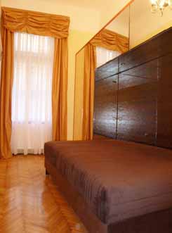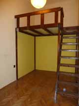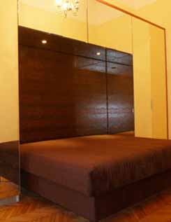 A hálószobában faltól falig húzódó szekrények oldalsó és felső kerete antik cseresznye. Két oldalt 2 db, 2 nyiló ajtós egyforma méretű, polcos és beakasztós szekrénnyel, az ágy fölött 2 db felnyiló ajtós áthidaló szekrénnyel. A 240 cm magas szekrények szélső ajtói magasfényű, lakkozott vanilla szinűek, az ágyhoz közelebbi ajtók és a szekrény oldalai (az ágy felöli részeken) ragasztott tükör boritásúak, az áthidalók alja és frontja is tükör boritású, melyeknek az aljába 2 db spotlámpa került. Az áthidaló alatti falra barna szinű, krokodil mintás műbőr falikárpitot (18 mm-es laminált lap + 5 cm vastagságú szivacs + műbőr) szereltünk, elé került a 140x200 cm-es, ágyneműtartós, barna szinű, kárpitozott Cardo ágy. Központi világitásnak 5 karú, gyertyaizzós, antic arany szinű csillárt szereltünk fel. A hálószobából nyiló tárolóba polcokat készitettünk.