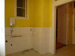 A funkcionálisan nem megfelelő belső elrendezés miatt a nappaliból nyiló fürdőszoba lett a konyha, melyek közötti válaszfalat kibontottuk, a közösségi teret egybenyitottuk. A régi konyhából nyiló kamra ajtót kibontottuk, bejáratát befalaztuk és a hálószobából nyitottuk bejáratot a tároló funkciót ellátó szellőzős helyiségnek, de a gyönyörű eredeti ajtót megmentettük és azt épitettük be. Az előszobából nyiló konyhából lett a fürdőszoba Wc-vel. A lihthofba kéményt épitettünk a kombi cirkónak, mely a fürdőszobában lett elhelyezve. A szobákban levő 2 parapet kivezetésű konvektor helyett lapradiátorokat szereltünk fel. A konyhába a lihthof ablak alá lapradiátor, a fürdőszobába törölközőszáritós csőradiátor került.