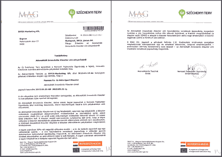 "A mai napi postával nagyon jó hírt kaptunk: megkapta a Pannon Fa- és Bútor Klaszter a Nyugat-Dunántúli régióban elsőként az Akkreditált Innovációs Klaszter címet és a tagok reményeink szerint hamarosan élvezhetik ennek előnyeit. Megköszönjük mindenkinek az adatszolgáltatást, a közös munkát. Azt is ki kell emelnünk érdekességképpen, hogy ez a Klaszter az első Magyarországon, amely hagyományos iparágra épülő együttműködő szervezet. ( többi általában high tech vonal, energetika, informatika, biotechnológia stb.) Reméljük hamarosan átbeszélhetjük, hogy miképp is tovább!"