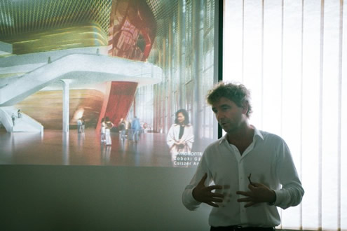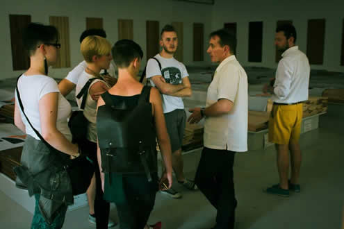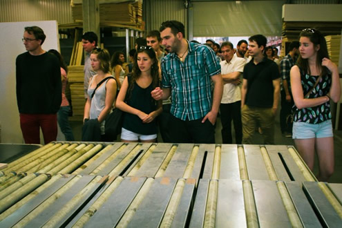 Pozsár Péter arra kérte a fiatal építészeket és designereket, hogy azzal a szemmel nézzék és tapintsák végig a Jaf Holz területén látható, különböző színű, fomájú és textúrájú fafajokat, hogy melyikkel dolgoznának az általuk elképzelt projekteken. Kedves tömeg andalgott végig a megszámlálhatatlan formájú, hosszúságú, tapintású, illatú faáruk mellett. Bejártunk mindent, a friss fák szárítási pihenőhelyétől a lapszabászaton át a furnér raktárig, betekintést nyerve egy precízen és így sikeresen működő cég tevékenységeibe.