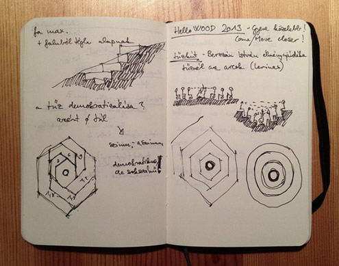 Mint kiderült, az étkezőasztalról a Sporaarchitects (Dékány Tibor, Harcsa Dia, Hatvani Ádám) és csapatuk fog gondoskodni. Nem vészes, csak negyven méter lesz. És variálható. Az eggyel korábbi generáció képviseletében, három fiatalember álmodott kültéri talponállót Kapolcs egyik kihasználatlan közterére, hogy később nyáron, a Művészetek Völgyén már csomó ember berúghasson és kidőlhessen rajt. Gál Béla, Frikker Zsolt és Vass-Eysen Áron szerintem ezzel a konkrét elképzeléssel álmodta ezt a falusias kuckót, többek között. Német, osztrák, katalán, holland, angol és lengyel workshopvezetők is lesznek ez évben a Hello Wood-on. Barcelonából Enrique Soriano és Pep Tornabell a CODA színeiben, Berlinből Holger Alpermann és diákalakulata, lengyel barátaink pedig az egyik legismertebb és legelismertebb építészirodából, a Moomoo-ból érkeznek, Łódź-ból (ejtsd: vúdzs). Polak węgier dwa bratanki i do szabli i do szklanki. A külföldi kontingenstől várható: végtelenített beszélgetésekhez nélkülözhetetlen, tudatalatti szimbolikával bíró kör, égen átpillantó űrbenéző a németektől(!), Żubrówkával átitatott, instant, szláv humorral fűrészelt formai találós kérdések és válaszok, és egyfajta hordozható, németalföldi elvágyódás, egy borderline kényelmetlen, konkrét céllal korlátozott kapacitású közösségi idogálló . Nagy Nándor és Szabó Bulcsú egy szélmalommal szeretnék munkába állítani a légmozgások energiáját, így vagy úgy, még nem tudni hogy. A koncepció a kísérletezés ésszerűsített Éroszával támad. Oliver Sales brit építész mutatta be, a Pap Bence, Zaha Hadid irodájában szocializálódott, osztrák építésszel megálmodott ötletcsokrát, arról, hogy a természeti minták funkcionális és esztétikai felhasználásával, miként tudjuk a bennünk rejlő tudást, tudatot és szeretetet, a természet és az ember szükségleteinek kielégítésébe integrálni.
