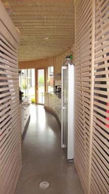 Mind vízszintesen, mind függőlegesen tekintve a látogató a folyamatos vonalvezetés hirtelen megtörését észleli, ahol maga a látvány jelenti az elhatárolást a fő beltér-résztől, meghatározva, hogy a nyitott stílusú fürdőszoba hol kezdődik, és hol van a hálószoba bejárata.