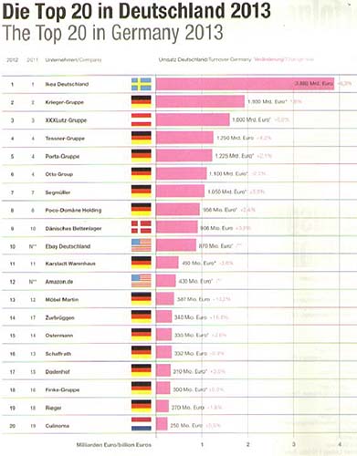A MÖBELMARKT elkészítette a speciális összeállítását, a 2013-as lakberendezési/bútorforgalmazó cégek, cégcsoportokk (valójában a 2012-es eredmények alapján összeállított aktuális lista - FATÁJ szerk.) európai/német toplistáját. Idén először már azt is megoldotta a szaklap szerkesztősége, hogy a listán megjelenhessen az Amazon és az Ebay online áruházlánc is (persze csak a bútorok forgalmi értékével)!