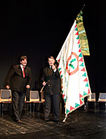 Végül Kocsis Mihály, a rendező Vértesi Erdő Zrt. vezérigazgatója, átadta a Vándorgyűlés vándorzászlaját dr. Jámbor Lászlónak, a TAEG Zrt. vezérigazgatójának, a jövő évi vándorgyűlés házigazdájának.