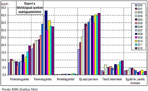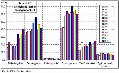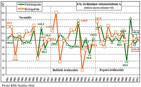 A hazai fűrészáru gyártás termelése 2012 I-IV. negyedévében 20,6%-kal emelkedett, az egy évvel korábbi 3,6%-os csökkenést követően. A hazai értékesítés 18,7%-kal, az export 21,9%-kal nőtt, a 2011 évi bázison (belföldi értékesítés -22,3%, exportértékesítés +26,1%). 2012 decemberében a termelés 11,4%-kal, az export 40,7%-kal visszaesett, a belföldi értékesítés ugyanakkor mindössze 0,2%-kal bővült, a 2011. decemberi szinthez képest. 2012 IV. negyedévén belül októberben a termelésbővülés elérte a 21 százalékot, novemberben (15%) és decemberben (-13%) azonban jelent ős mértékű csökkenés következett be. A belföldi értékesítés a negyedév folyamán 0,2-26% közötti mértékben emelkedett, üteme azonban lassult. A fűrészüzemek kivitele 2012. IV. negyedévében 22%-kal mérséklődött. Az októberi 2,2 bővülést, és a novemberi 25%-os csökkenést követően szeptemberben újabb 40,7%-kal mérséklődött. A fűrészárugyártás ez évi szokatlanul erőteljes növekedésében szerepet játszhatott az adatszolgáltatók körének bővülése és javulása is, melyben a FAGOSZ (Fagazdasági Országos Szakmai Szövetség) jelentős részt vállalt.
