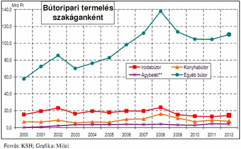 Bútorgyártásunk tendenciájában szintén követi az európai folyamatokat a fordulatok azonban sokkal élesebbek, a csúcsok magasabbak, a visszaesések mélyebbek. Ennek a tendenciának a folytatását láthattuk 2010-ben is. 2011 egyes negyedéveiben a csökkenés üteme lassult, az utolsó negyedévben pedig növekedésbe fordult. A bútorgyártás teljesítménye 2011-ben, az EU-s eredményekkel ellentétben, 1%-kal csökkent. Az éves összteljesítmény visszaesése lényegében a harmadik negyedévben bekövetkezett 6,8%-os termeléscsökkenésre vezethető vissza. Az év első felében, illetve a negyedik negyedévben az ágazat pozitív egyenleggel zárt. 2012 január-márciusban, illetve április-júniusában (2,12,1%) az ágazat termelése növekedett az el őző év utolsó negyedévének pozitív tendenciáját folytatva. A harmadik és negyedik negyedévben a bővülés folytatódott (3,2, illetve 1,7%), az előző évi 6,9% csökkenés, illetve 0,3%-os növekedés bázisán. Éves szinten a termelés bővülése 2,2% volt.