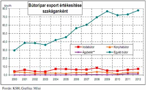 A bútorgyártás (TEÁOR 31) 2012. évi termelési értéke 136 445,8 millió Ft, belföldi árbevétele 47 128,4 millió Ft, export árbevétele 89 317,4 millió Ft volt. A bútoripar termelése 2012 I-IV. negyedévében 1,1%-kal nőtt, az egy évvel korábbi 1,2%-os csökkenés bázisán. A bútoripar hazai eladásai a 2011 évi 8,2%-os visszaeséssel szemben 2012-ben további 3,5%-kal csökkent. A bútoripari export ugyanakkor 3,0%-kal nőtt az egy évvel korábbi 2,9%-os növekedés bázisán. 2012. decemberében a bútoripar termelése 0,5%-kal, belföldi értékesítése 10,7%-kal emelkedett, export értékesítése pedig 11,4%-kal visszaesett 2011. decemberéhez képest, amikor a termelés 0,3, a belföldi értékesítés 8,9%-kal mérséklődött, az export pedig 7,9%kal emelkedett. A négy negyedéven belül a az első negyedévben a kivitel és a termelés emelkedett, a másodikban lényegében stagnált, míg a harmadikban a termelés stagnált a kivitel kismértékű emelkedése mellett. A hazai értékesítés az előzőekkel ellentétes mozgást mutatott, az év első és harmadik negyedében csökkent, míg a másodikban bővült. A negyedik negyedévben a termelés stagnálás közeli emelkedést mutatott, a belföldi értékesítés továbbra is csökkent, míg a kivitel kismértékben emelkedett.
