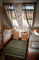 A tetőtéri szobák egyike, illetve terasz az épület mögött.