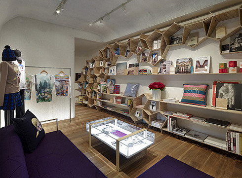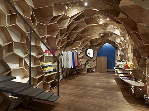 Kengo Kuma japán dizájner ebből a megfontolásból kaptárszerű képződménnyé változtatta egy tokiói, butikként és kávézóként működő épület belső tereit. A Shinsaibashi nevű, kávézót és egy Lucien Pellat-Finet butikot magában foglaló üzlet helyiségei egy rétegelt-lemezekből álló, méhkasra emlékeztető fa-fal-burkolatot, pontosabban polcrendszert kaptak. Ötszög és paralelogramma alakú motívumok terítik be a falakat az összes szinten, a kávézóban és a könyvtárban is.