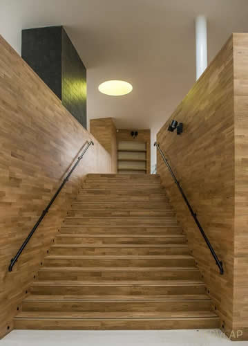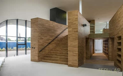Bevágásai fényt engednek a lágy forma által körbeölelt belsőben elhelyezett fahasábokba. Laura Lee, a Maggie's vezetője szerint az épület biztonságérzetet nyújt majd a gondozottakszámára.
