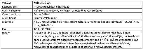 A Control Union Certifications (CUC) ezúton közzéteszi, hogy tanúsító auditot hajt végre a FSCCUSTAND-HUN R01v08-1 HUN (A CUC magyarországi kiértékelésekre adaptált erdőgazdálkodási szabványai) szabvány alapján. Ez a szabvány erről a linkről megnyitható.