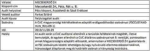 A Control Union Certifications (CUC) ezúton közzéteszi, hogy tanúsító auditot hajt végre a FSCCUSTAND-HUN R01v08-1 HUN (A CUC magyarországi kiértékelésekre adaptált erdőgazdálkodási szabványai) szabvány alapján. Ez a szabvány erről a linkről megnyitható.