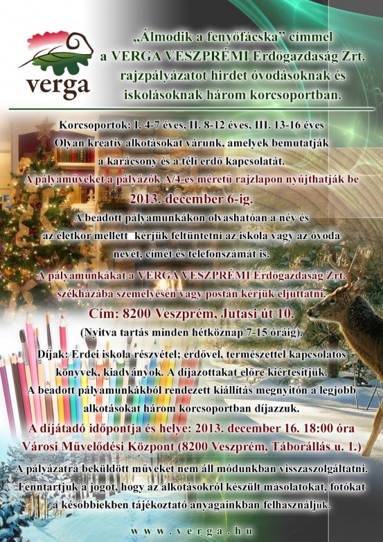 Álmodik a fenyőfácska címmel három korcsoportban, óvodásoknak és iskolásoknak hirdet rajzpályázatot a VERGA Veszprémi Erdőgazdaság Zrt.