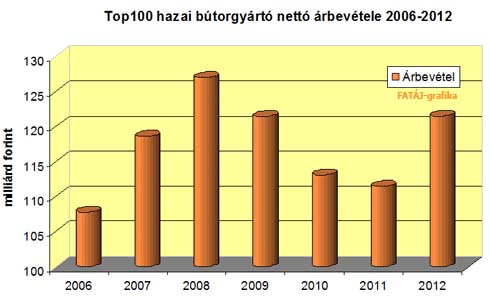 Az adatgyűjtésünk ez alkalommal is rávilágított egy igen fontos sajátosságra. A Top100-as listánk 100 bútorgyártó vállalkozása 2012. évben 121,51 milliárd Ft árbevételt realizált, ami 89,05%-a a KSH által publikált (TEÁOR 31) országos mindösszesen 136,446 milliárd Ft-nak!