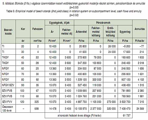 Eredmények és megvitatásuk - erdőrészletszintű elemzés Az erdőrészletszintű elemzés eredményeit a szakirodalomban megszokott módon összeállított táblázatok mutatják be (Schiberna és mtsai 2012). A táblázat alapadatait komplex ökonómiai modellek, az eredményeket az előzőekben bemutatott feldolgozási módszerek szolgáltatták. Az 5. táblázat a tapasztalati modell alapján a vágásos üzemmódban lévő átlagos erdőrészletben kapott eredményeket mutatja be. Az átlagos árbevétel és fakitermelési díj az összesen sorban található.