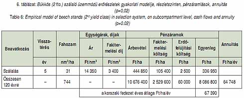 A 6. táblázat a szálaló üzemmódban lévő átlagos erdőrészlet teljesítményét tartalmazza az adatok alapján. Amennyiben a hozamot lecsökkentettem a vágásos üzemmód átlagos hozamára (698 nm3), a többi adat változatlanul hagyása mellett az annuitás a táblázatban szereplő értékhez képest csak elhanyagolható mértékben, 64262 Ft/ha/év értékre csökken.