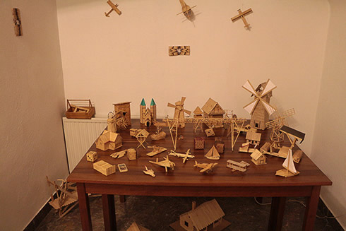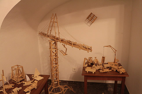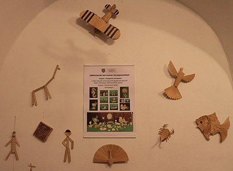 A kiállítás tehát két részre bontható: játék a fával és játék a papírral. A fajátékok mind olyan faipari termékekből készültek, amelyek kereskedelmi forgalomban beszereztetők - mint a tipli, spatula, hurkapálca -, és az alkotói kreativitásra bízva, minimális megmunkálással, első sorban ragasztással válnak komplex tárgyakká a hallgatók kezében. Ki-ki megtalálhatja itt a kedvenc tematikáját: a logikai játékokat, állatokat, bútorokat, de még sakkot is.