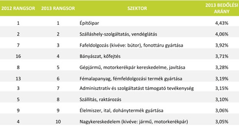 A Bisnode Bedőlési Index mértéke (felszámolások és csődeljárások cégszámhoz viszonyított aránya) azonban továbbra is jó mutatószám a cégek fizetésképtelenségének megállapítására, illetve az egyes szektorok teljesítményének összehasonlítására, mivel ez tisztán a hitelezők felé történő tartozások miatti fizetésképtelenség jelzésére szolgál. 2013-ban ennek megfelelően 2,46 %-os Bisnode Bedőlési Index-el kellett számolnunk, azaz a cégek közel 2,5 százaléka válik egy éven belül fizetésképtelenné. Ezen kívül a cégek 4,09 %-át érinti egy év alatt kényszertörlés, ami később akár felszámolásba is átmehet. A legkisebb bedőlési aránnyal rendelkezők listáján tavaly nem történt nagy átrendeződés a 2012-es évhez képest. Az információval és kommunikációval foglalkozó cégek a korábbinál még előkelőbb helyen szerepelnek a legkevésbé kockázatos cégek listáján, az egyéb feldolgozóiparral (pl.: ékszer, sportszer, hangszergyártással) foglalkozó vállalkozások viszont a többi szektorhoz képest a korábbiaknál kockázatosabbá váltak. Az építőipar évek óta a legkockázatosabb iparágnak számít hazánkban. Nem volt ez másként 2013-ban sem. A szektor bedőlési aránya jelenleg jóval az átlag felett van, és majdnem eléri a 4,5 százalékos értéket. Kockázatosnak számít még a szálláshely szolgáltatás és vendéglátás, a fafeldolgozás, a bányászat és a gépjármű-kereskedelem is. A logisztika tudott javítani tavalyi helyezetéshez képest, ugyanis 2012-ben még az 5. legkockázatosabb szektor volt, ma pedig már "csak" a nyolcadik. A tavalyi listán 6. volt a bútorgyártás, de 2013-ban már a 12. lett, azaz jelentősen javult a szektor kockázatossága.