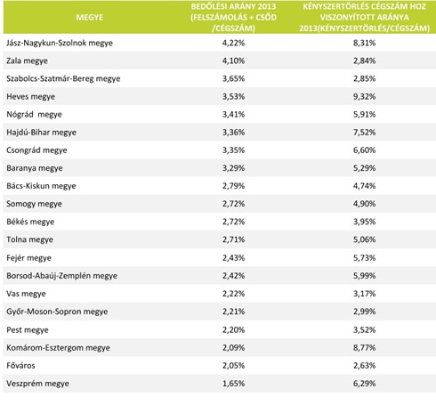 Megyénként különbözik a cégbírósági gyakorlat a kényszertörlések terén, ugyanis van olyan megye ahol ezt szép számmal alkalmazzák, és ezért akár a cégek közel 10 százalékát is érintette ilyen esemény, de van ahol kevésbé elterjedt ez a gyakorlat. Fizetésképtelenség szempontjából Jász-Nagykun-Szolnok, Zala és Szatmár-Bereg megye számít a legkockázatosabbnak, és ezen területek közül csupán Jász-Nagykun-Szolnok megye az, ahol magas a kényszertörlési eljárások cégszámhoz viszonyított aránya is. 2013-ban Komárom-Esztergom, Budapest és Veszprém megye számított a legkisebb kockázatú területnek. Ezek közül azonban csak Komárom-Esztergom megye az, ahol igen magas a kényszertörlések aránya is. Általában alacsonyabb cégbedőlési aránnyal a nyugati, míg magasabbal a keleti megyékben kell számolni, azaz az ország kelet-nyugat irányú széttagoltsága továbbra is megmaradt. Az adatokból látszik, hogy Jász-Nagykun-Szolnok, Heves és Komárom-Esztergom megyében a legnagyobb a kényszertörlések aránya, azaz, ha itt tevékenykedik egy cég, és nem ad le beszámolót, vagy nem veszi át hivatalos leveleit, netán nem fizet adót, akkor a cégbíróság feltehetően nagyon határozott lépéseket fog tenni.