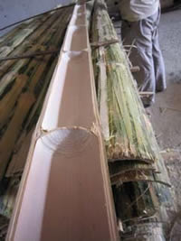 A bambusz hosszirányában a sejtek erős kapcsolatban vannak, ezért a hasítás során a hasadás a paláston hosszirányban fut végig, így a szegmensek szélessége azonos lesz. A henger belsejében zárt nóduszok a hasító fejen áttolva szintén szegmensekre szakadnak. Az így nyert szegmenseket többfejes gyalugéppel négyszög keresztmetszetre munkálják, ahol a nódusz belső maradvány részeit is leválasztják (2. kép). Ezt követően a bambusz szálakat szárítják és a további felhasználás módjától függően csiszolják vagy egy finom gyalulást végeznek rajta.