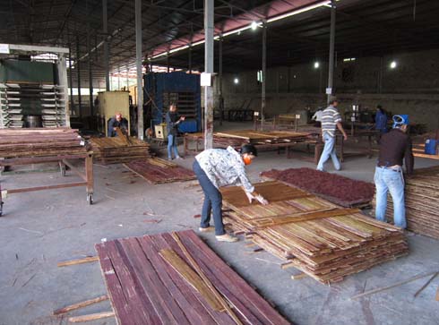 A teríték képzést követően általában hőprésben alakítják ki a tábla végleges méreteit. A bambusz táblák gyártása során sok esetben már az üzemben termékké alakítják a táblákat, formázással és a szükséges kapcsolódási pontok kialakításával. A bambusz termékek gyártása a legtöbb esetben nem az európai munkavédelmi előírásoknak megfelelően történik. Előfordul, hogy balesetveszélyes technológiák vagy berendezésekkel állítják elő a termékeket, amelyek a költséges biztonsági berendezések híján így még olcsóbbá teszik az előállítást. Feltehetően a költségcsökkentést szolgálja az is, hogy a műveletek többségének elvégzésére főként nőket alkalmaznak.