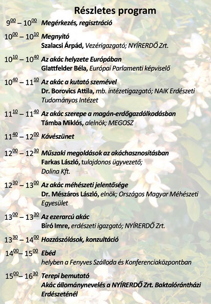 A konferencián elhangzott: Magyarországon 460 ezer hektár akácos van, amelynek többsége a Nyírségben található. A növény több tízezer ember megélhetését biztosítja vagy az erdőgazdálkodáson, vagy a méztermelésen keresztül. A rendezvényen részt vett Glattfelder Béla európai parlamenti képviselő is, aki elmondta, a kormány elkötelezett az akác hazai termesztése mellett.