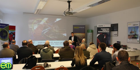 A szakember olyan innovációkat is bemutatott, mint például a Triple-Z teleszkópos nagygém, aminek előnye, hogy akár egy 9-9,5 méter kinyúlással rendelkező daru is összecsukható a fülke mögött úgy, hogy az összecsukott darugém nem lóg a váz (felszerelési sík) alá. Szintén komoly újítás az Easy Flod rendszer, amely az erdőgazdálkodóknak is hasznos lehet. "A Z daruknál a daru összecsukásához hely kell, de előállhat olyan helyzet, amikor az nincs. Az új fejlesztésnek köszönhető, hogy egy átvető lánccal sikerült a problémát áthidalni, és a daru már a levegőben is összecsukható". Szintén a gyártó különleges megoldása az oszlop nélküli daru, amely kommunális felhasználás esetén nyújt segítséget, hiszen az eszközt közvetlenül a konténer tetejére lehet felrakni. Kristofics Károly bemutatta a Palfinger-Epsilon legújabb daruját is. A fejlesztés igényét az útdíjak teremtették meg. A felhasználók egy "útdíj-mentes" traktorra könnyen és gyorsan felszerelhető, az erdészeti igényeknek megfelelően erős letalpalóval ellátott darut szerettek volna, amit a KUHN Rakodógép Kft. már forgalmazni is kezdett. A szakember előadásában elmondta; a gyártónak forwarderre és harvesterre készített darui is vannak, utóbbi ráadásul tavalyelőtti fejlesztés, kiváló tapasztalatokkal. "A Palfinger-Epsilon daruk minőségét jelzi az is, hogy Európa-szerte az aprítógépekhez szinte kizárólag ezt a márkát használják" - hangsúlyozta Kristofics Károly.