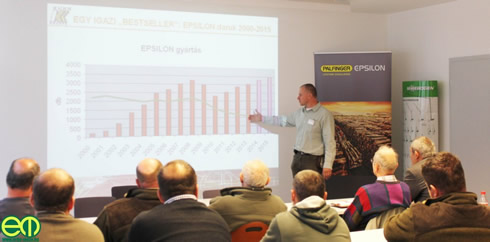 Innováció - a siker receptje Kristofics Károly, a Palfinger-Epsilon daruk értékesítési vezetője a szakmai nap középpontjában álló gépeket mutatta be az erdőgazdálkodóknak. Előadásában kifejtette; az Epsilon gyár 2000-ben még csak 300 alatti éves darabszámmal működött, amely 2008-ra 3000 fölé emelkedett. Ezzel a nem mindennapi fejlődéssel az Epsilon immár világelső a teherautóra szerelt hulladékrakodó és erdészeti daruk gyártói között. A kiváló eredmények receptje a szakember szerint az innováció, amely különösen fontos a gyártónál. Az elmúlt évek fejlesztései közül kiemelkedő, hogy minden új persely bronzból készül zsírcsatornákkal, de a gémen belül vezetett tömlők is forradalmi újítás eredménye. "Amikor ezt bevezették, sokan azt gondolták, hogy nem lesz jó megoldás, mert a tömlőket nehéz lesz majd cserélni. De van olyan partnerünk, akinél öt évig is bírták ezek a belső tömlők" - magyarázta Kristofics Károly, aki hozzátette; a belső elvezetés kevesebb lehetőséget ad a szakadásra, roncsolódásra.