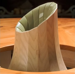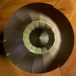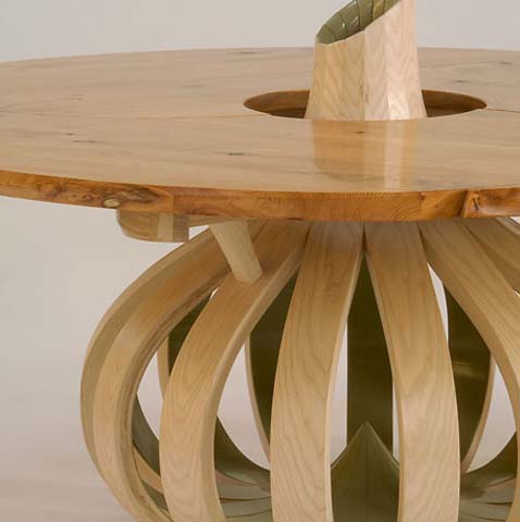 Az asztalt tartó szerkezet lényege, hogy olyan minet egy hagyma. Anyaga kőris és tiszafa. Az alkalmazott technika nagyon időigényes. Ez minden bizonnyal megéri, mivel az eredmény lenyűgöző.