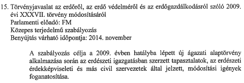 Az Országgyűlés honlapján az E-futár menü alatt található az Országgyűlés 2014. évi őszi ülésszakára vonatkozó törvényalkotási program a Plenáris ülés első hasáb alsó részében. E programot dr. Semjén Zsolt miniszterelnök-helyettes június 13-án nyújtotta be dr. Kövér László, az Országgyűlés elnöke részére, jelezve, hogy a programot szeptemberben várhatóan felülvizsgálják, így tartalma akkor változhat majd. Minden esetre decemberi tárgyalásra szerepel benne az Erdőtörvény módosítása novemberi benyújtással. Figyelemre méltó a célmegjelölésben az igazgatási tapasztalatok mellett az érdekképviseleti igények foganatosítása!