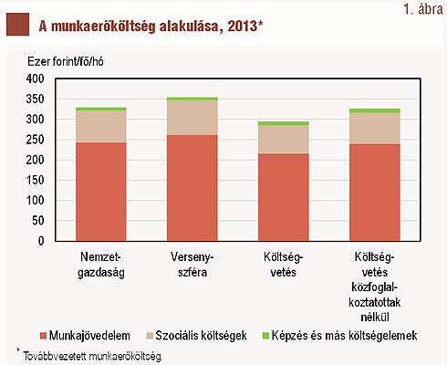 Négy év alatt lassan nőtt A 2012-es adatok szerint a munkaerőköltségből a munkajövedelmek részaránya 75,1 százalék volt (szemben a 2008-as 70,5 százalékkal), míg a szociális költségeké 22,3 százalék volt (holott négy évvel korábban még 26,4 százalék), a képzés és más költségelemek súlya pedig alig 2,6 százalékra rúgott (a korábbi 3,1 százalék után). A havi átlagos munkaerőköltség 2012-ben átlagosan 312,4 ezer forint volt, ez nominálisan 6,7 százalékkal múlta felül a 2008-ast, vagyis évente átlagosan 1,6 százalék lett magasabb az alkalmaztatás költsége. Ebben az időszakban a bruttó munkajövedelem 13,8 százalékkal nőtt, míg a szociális költségek, a képzés és más költségek 10, illetve 10,7 százalékkal csökkentek.