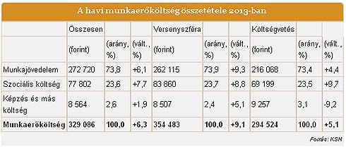 Az emelkedést döntően a versenyszféra (a legalább ötfős vállalkozások körében) munkajövedelmének alakulása magyarázza, ott ugyanis 9,3 százalékos bővülést mértek (de a szociális költség is 8,8 százalékkal nőtt), míg a költségvetési szférában 4,4 százalékkal csökkent az átlagos munkajövedelem, alapvetően annak köszönhetően, hogy 2013-ben is dinamikusan (+26,6 százalék) nőtt az alacsony keresetű közfoglalkoztatottak száma az egy évvel korábbihoz viszonyítva. A KSH azt is kiszámolta, hogy a közfoglalkoztatottak hatását kiszűrve 2013-ban az átlagos havi munkajövedelem 240 ezer forintra volt becsülhető, ami 11,1 százalékkal magasabb, mint a teljes költségvetésre vonatkozó átlag. Összességében a közfoglalkoztatottak bérének figyelmen kívül hagyásával, a havi munkaerőköltség 295 ezer helyett 326 ezer forintot tett ki a közszférában 2013-ban. Így mindent figyelembe véve tavaly a bruttó munkajövedelem 6,1, a szociális költségek 7,4 százalékkal emelkedtek, míg az egyéb költségek pedig 1,9 százalékkal mérséklődtek 2012-höz viszonyítva.