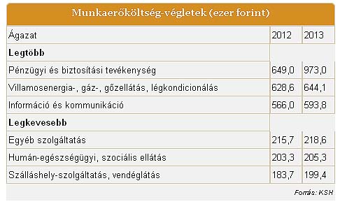 A bankok, az energetika és az olajcégek fizetnek a legjobban A KSH számításai szerint 2012-ben a havi átlagos munkaerőköltség a legalább ötven főt foglalkoztató vállalkozásoknál, a költségvetési intézményeknél és a kijelölt nonprofit szervezeteknél folyó áron 312,4 ezer forint volt (1 079 euró); ezen belül a közszférára jellemző költségszint 283 ezer forintnak (978 euró), míg a vállalkozói köré 327,7 ezer forintnak (1 132 euró) felelt meg. Kiugróan magas volt az élőmunka költsége a pénzügyi és biztosítási tevékenységben, az energetikában, valamint a kőolaj-feldolgozásban, melyeknél a munkaerőköltség több mint kétszerese a nemzetgazdasági átlagnak. Az élőmunka költsége nem érte el viszont a nemzetgazdasági átlag kétharmadát a szálláshely-szolgáltatásban, a vendéglátásban, az egészségügyben, valamint textil-, ruházati és bőriparban. Emellett az átlagosnál lényegesen alacsonyabb munkaerőköltség jellemezte a mezőgazdaságot és az egyéb szolgáltatásokat. A legmagasabb és a legalacsonyabb munkaerőköltségű gazdasági ágak sorrendje 2008 óta lényegében nem változott.