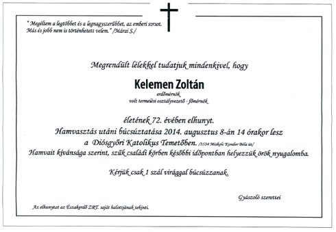 A gyászoló család megrendülten tudatja, hogy Kelemen Zoltán erdőmérnök, az Északerdő volt termelési osztályvezetője, főmérnöke életének 72. évében elhunyt. Búcsúztatása augusztus 8-án lesz Miskolcon.