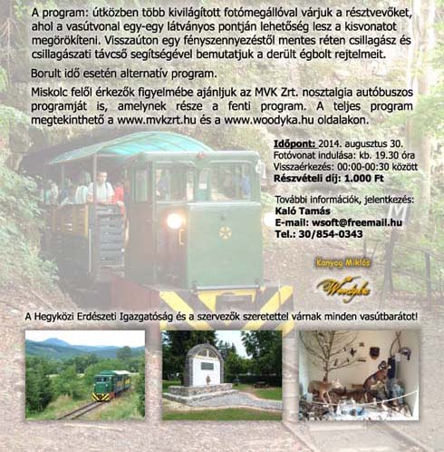 A vonal több pontján alkalom nyílik a kisvonat megörökítésére, a visszaúton pedig egy csillagász avat be mindenkit a derült égbolt rejtelmeibe.