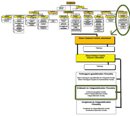 7.1. Állami földekért felelős helyettes államtitkár 7.1.1. Állami földekért felelős helyettes államtitkár titkársága 7.1.2. Földvagyon-gazdálkodási Főosztály 7.1.2.1. Állami Földvagyon-gazdálkodási és Felügyeleti Osztály 7.1.2.2. Állami Földvagyon-forgalmi és Nyilvántartási Osztály 7.1.3. Erdészeti és Vadgazdálkodási Főosztály 7.1.3.1. Erdészeti Igazgatási Osztály 7.1.3.2. Állami Erdőgazdálkodási Osztály 7.1.3.3. Vadgazdálkodási Osztály 7.1.4. Horgászati és Halgazdálkodási Főosztály 7.1.4.1. Horgászati és Halgazdálkodási Osztály 7.1.4.2. Akvakultúra-fejlesztési Osztály
