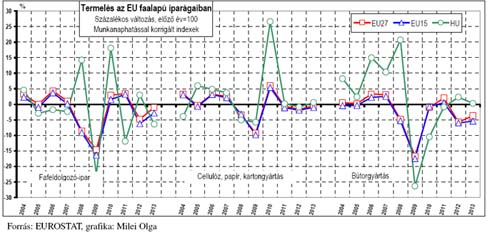 A fafeldolgozó-ipar termelése 2013-ban 6,5%-kal csökkent az egy évvel korábbi 2,3%-os növekedés bázisán. 2013 decemberében 5,6%-kal emelkedett a kibocsátás az előző évi 13,8%-os csökkenés bázisán. A szakágazat hazai értékesítése 2013-ban 8,2%-kal visszaesett, decemberben pedig 13,2%-kal nőtt. A 2013 évi exportértékesítés 4,4%-kal csökkent a múlt évi 0,8%-os növekedés bázisán, decemberben pedig a szakágazat kivitele 8,9%-kal emelkedett az egy évvel korábbi 29,0%-os visszaesés bázisán.