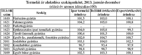 A fafeldolgozó ipar termelői ára 2013 január-decemberben 3,2%-kal volt magasabb az egy évvel korábbinál. A belföldi értékesítési árak 0,3%-kal, az export értékesítés árai 5,0%-kal haladták meg az egy évvel korábbit. A bútoripar termelői ára 2013-ban 2,1%-kal emelkedett az egy évvel korábbihoz képest. Ezen belül a hazai értékesítés árszintje 0,1%-kal, az exporté pedig 3,1%-kal emelkedett a 2012 évi árszinthez képest. Az építőipari tevékenység termelői árai 2013-ban 1,9%-kal emelkedtek az egy évvel korábbihoz képest. Az épületek építése ágazatban 1,3%-kal, az egyéb építmények építése ágazatban 2,8%-kal, a speciális szaképítés ágazatban 1,7%-kal volt magasabb a termelői ár, mint 2012. január- decemberben.
