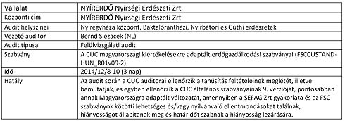 A Control Union Certifications (CUC) ezúton közzéteszi, hogy tanúsító auditot folytat a CUC magyarországi kiértékelésekre adaptált erdőgazdálkodási szabványai (a FSCCUSTAND-HUN R01v09-2) alapján. Ez a szabvány erről a linkről megnyitható.