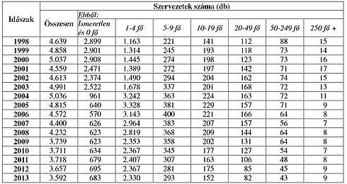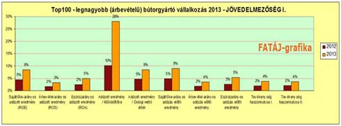 Üzemi eredmény nagyságrendje Az összesített számadatok szerint 2007-ben a legnagyobb 100 cég együttesen 4.708 millió forintnyi üzemi eredményt ért el; 2008-ban 4.988 millió forintot, ugyanez a szám 2009-ben 4.246 millió forint, 2010-ben 4.223 millió forint, 2011-ben 4.254 millió forint, 2012-ben 2.415 millió forint, míg 2013-ban 4.863 millió forint összeget tett ki. Ez az üzemi eredmény 201%-os növekedését jelenti az előző évhez képest.