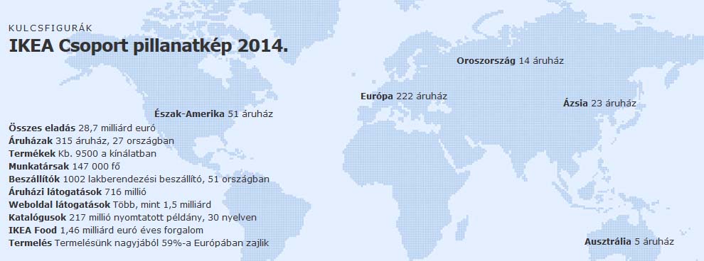 Az IKEA szerdai tájékoztatása szerint jól teljesítettek az észak-amerikai piacon, és még Európában is sikerült javítaniuk helyzetükön a nehéz gazdasági körülmények ellenére is. Az IKEA különösen jó jelnek tartja, hogy Európa déli részén is növekedni tudtak, főleg Portugáliában, de még Spanyolországban is. A cég szerint majdnem minden piacukon növelték eladásaikat, a legnagyobb fejlődés Kínában, Oroszországban és Magyarországon volt. A vállalat nyeresége 0,4 százalékos éves növekedéssel 3,33 milliárd euróra emelkedett. Az IKEA 1,7 milliárd eurót költött a 2014-es üzleti évében új boltokra, gyárakra és bevásárlóközpontokra. A vállalatnak 315 üzlete van 27 országban.