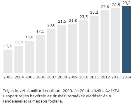 Rekordbevételt ért el az IKEA bútoráruházlánc a 2014. augusztus 31-én véget ért üzleti évében. A bevétel 29,29 milliárd euróra nőtt a 2013-as üzleti év 28,5 milliárd eurós bevételéről.