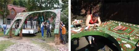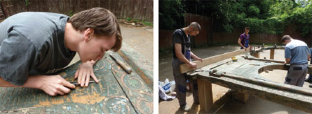 A munkát május 10-én kezdtük. Általában a hétvégéken tudtunk dolgozni, bár ezt az idei év esős nyara esetenként erősen korlátozta. Egy-egy alkalommal 7-8 diákkal mentünk a helyszínre, felszerelve szerszámokkal, anyagokkal és lelkesedéssel. A terület jelenleg a Szent Kozma és Damján Rehabilitációs Kórház tulajdona. Az étkezést és a szállást a kórház biztosította számunkra (igen színvonalasan). A négy és fél hónapig tartó felújítás alatt lefektettük a kaput (a 450 kg-os szerkezetet egyben hagyva ez elég összetett feladatot jelentett), majd lebontottunk róla minden elkorhadt alkatrészt. A felső összekötő szemöldökgerenda tetejéről 4 cm-t szintén a korhadás miatt el kellett távolítani, majd vízálló ragasztóval rögzítve visszapótolni tölggyel. A ráfestést több hetet jelentő sziszifuszi munkával, mechanikus úton távolítottuk el. Közben nagyon kellett vigyáznunk arra, hogy a plasztikus faragások, az oszlopok kiemelkedő részei ne sérüljenek. A munkák közben többször konzultáltam a témát legjobban ismerő Balassa M. István néprajzkutatóval (aki könyvet is írt a székelykapukról). Hasznos tanácsait a munkák során igyekeztünk figyelembe venni. A teljes mechanikus letisztítás során sikerült beazonosítani az eredeti festés színeit. A visszafestést a korabeli technológiához hasonló módon vízálló ragasztóba kevert oxidpigmentekkel végeztük. A különbség annyi volt, hogy korábban kazein alapú anyaggal (túróenyv) dolgoztak, mi pedig egy diszperziós alapú (D4) faragasztót használtunk. Az idők során keletkezett, ujjnyi széles mély repedéseket tölgy fűrészpor és ragasztó összekeverésével készült masszával töltöttük fel.
