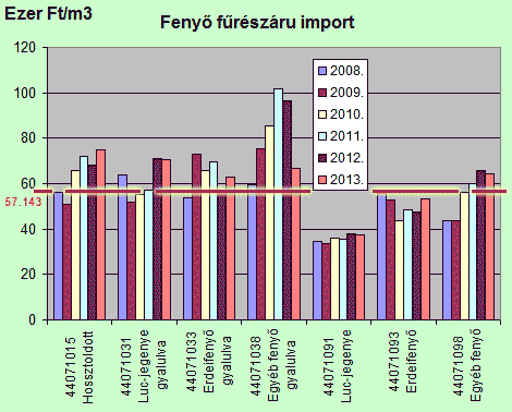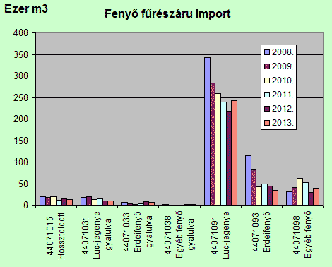 Az összes import tehát a több mint fél millió m3-ről csökkent kb 350 ezer m3-re. (Volt idő, amikor még évi 1 millió m3 felett járt, de akkor több volt az építkezés és kevésbé fejlettek voltak a felhasználási módszerek, technológiák.) Ezen belül a grafikon mutatja, hogy a gyalulatlan, toldatlan luc-jegenye fűrészáru e termékcsoport zömét teszi ki. (2013-ban a 348 e m3-ből 242 e m3-t tett ki.) A megmunkálatlan erdeifenyő és egyéb fenyő tételek ettől elmaradnak, a gyalult és hossztoldott áru importja pedig egészen csekély. Ha egy szállítmány 35 m3 (22 t), akkor a teljes fenyő fűrészáru importunk a 2013. évi adat alapján 9.955, kerekítve 10 ezer fuvart tesz ki. (Persze a többnyire kereskedőkhöz érkező árut utána még a felhasználójához is el kell juttatni, tehát valójában ez másfél-kétszer ennyi fuvar.)