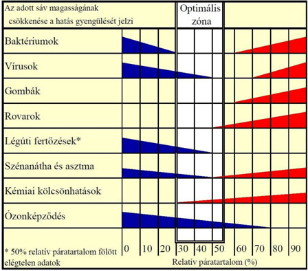Higiéniai, ill. egészségügyi tényezők a szobai levegő relatív nedvességtartalmának függvényében. Az ember számára legelőnyösebb relatív páratartalom 30-55% között van.